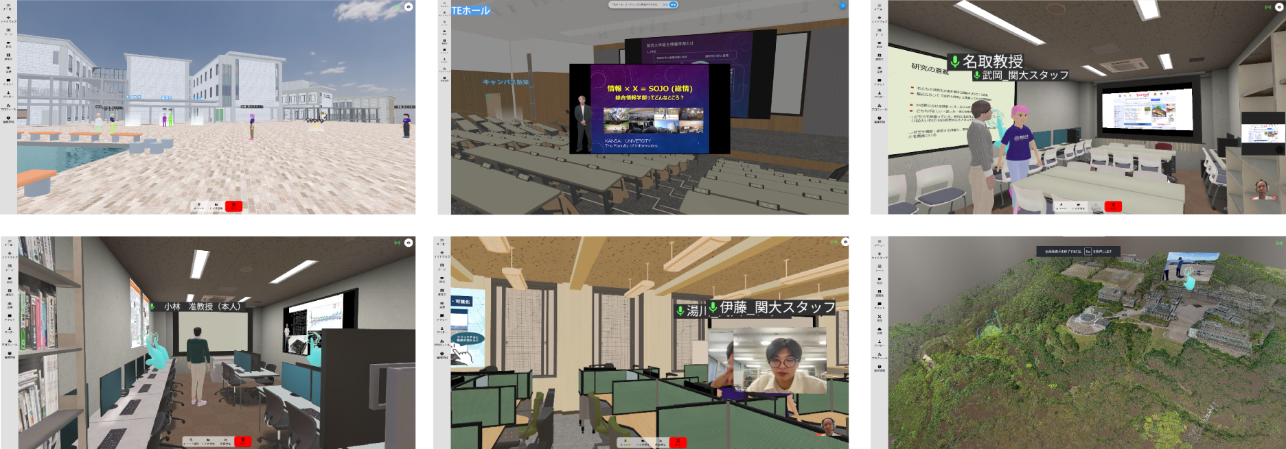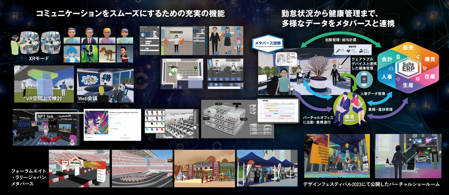 クラウド上に3DVRで構築された空間と、アバターを介したコミュニケーションツールを用いて、テレワーク推進、バーチャルショールームや工場見学、作業訓練や業務管理などが可能。展示会・オフィス・キャンパスなどあらゆる空間をVR上に再現。人事・業務管理等のERPシステムやスイート会計、スマートデバイスとも連携。