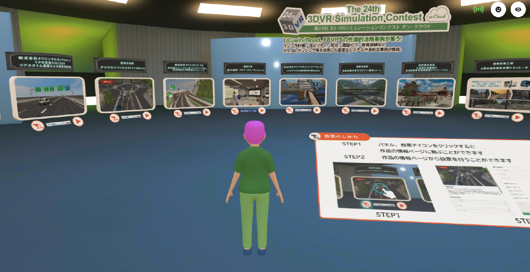 国内外からUC-win/Roadによる高度なVRデータ作品が集められる3D・VRシミュレーションコンテストは、2002年のUC-win/Road「ソフトウェア・プロダクト・オブ・ザ・イヤー」受賞を機にスタートして、FORUM8デザインフェスティバルのメインイベントとして毎年開催され、本年で25回目を迎えます。2011年からはVR-Cloud®によるクラウド一般投票が選考プロセスに追加され、2024年にはメタバニアF8VPSによるメタバースでの投票を行い、コンテストを盛り上げてきました。